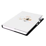 Diár obsahuje: okrúhle odtrhávcie rožky, bielu záložku a pero