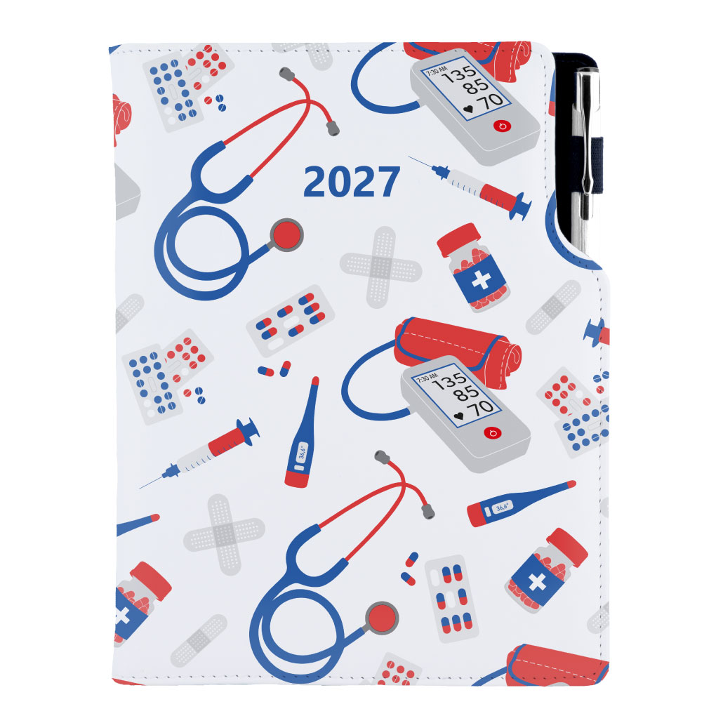 Diár obsahuje: okrúhle odtrhávcie rožky, bielu záložku a pero