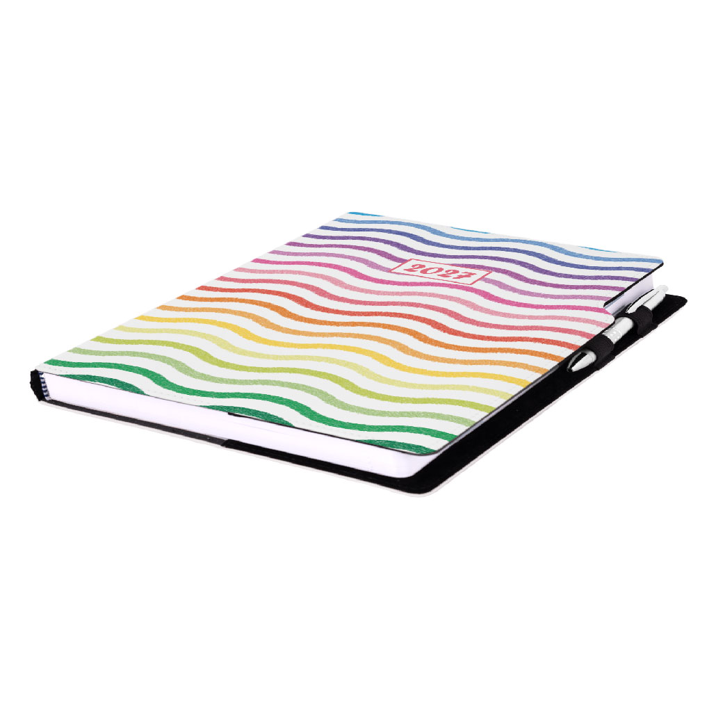 Diár obsahuje: okrúhle odtrhávcie rožky, bielu záložku a pero