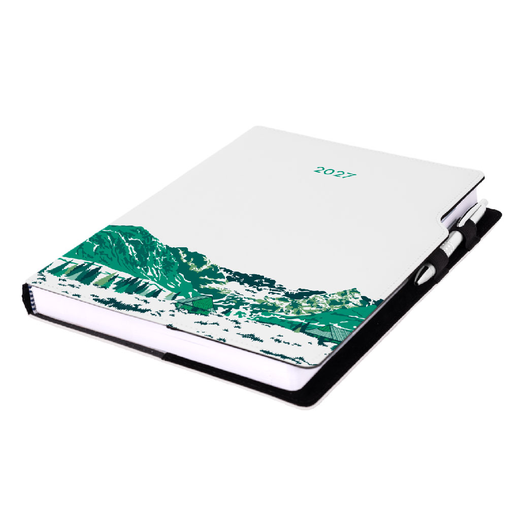 Diár obsahuje: okrúhle odtrhávcie rožky, bielu záložku a pero