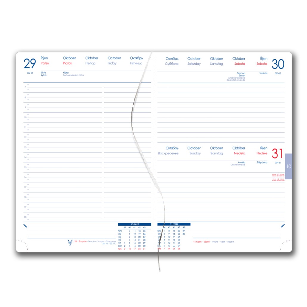 Diár obsahuje: okrúhle odtrhávacie rožky a bielou záložku