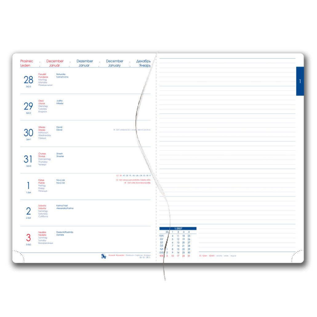 Kalendárium: týždenné menné CZ/SK na jednej strane + strana na poznámky
