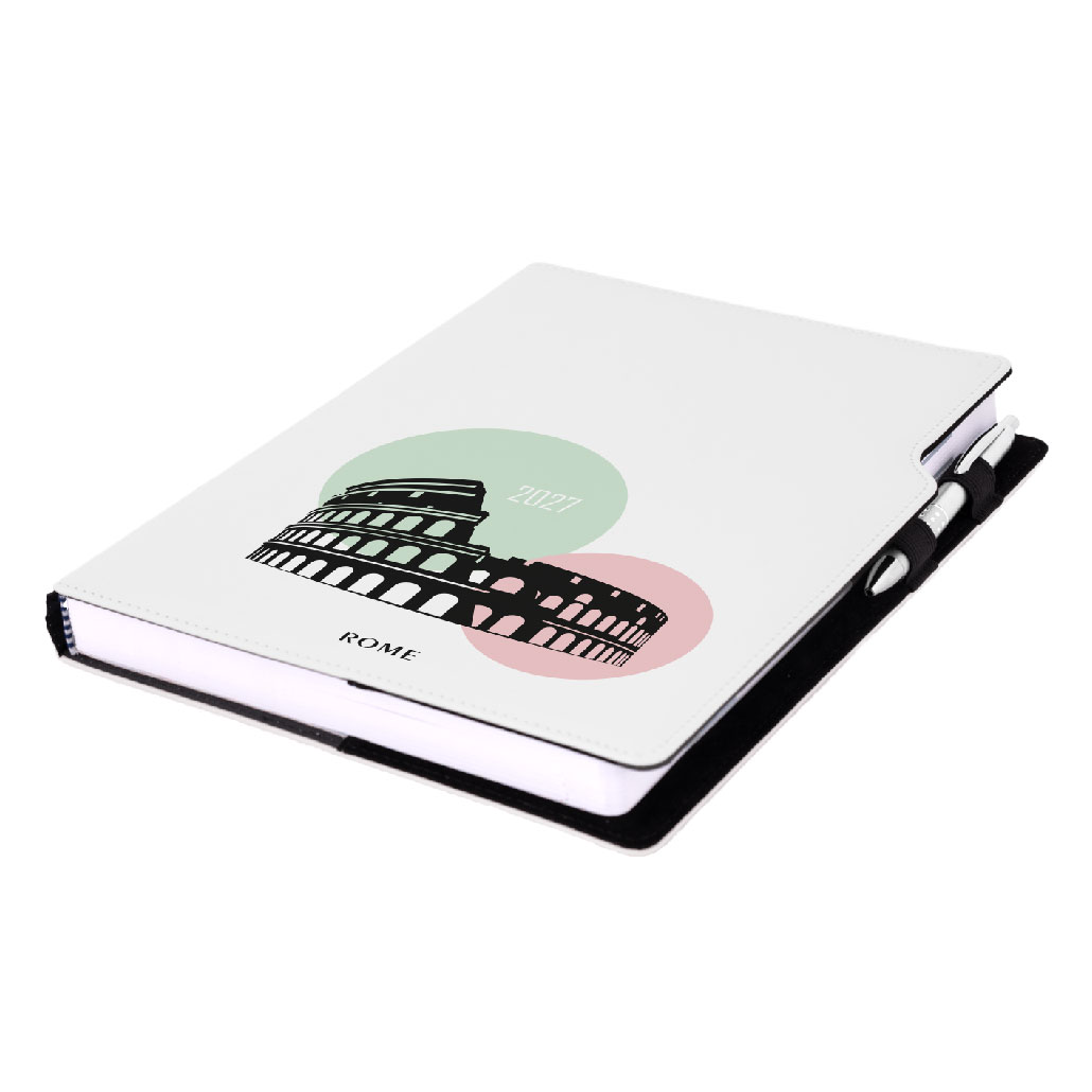 Diár obsahuje: okrúhle odtrhávcie rožky, bielu záložku a pero