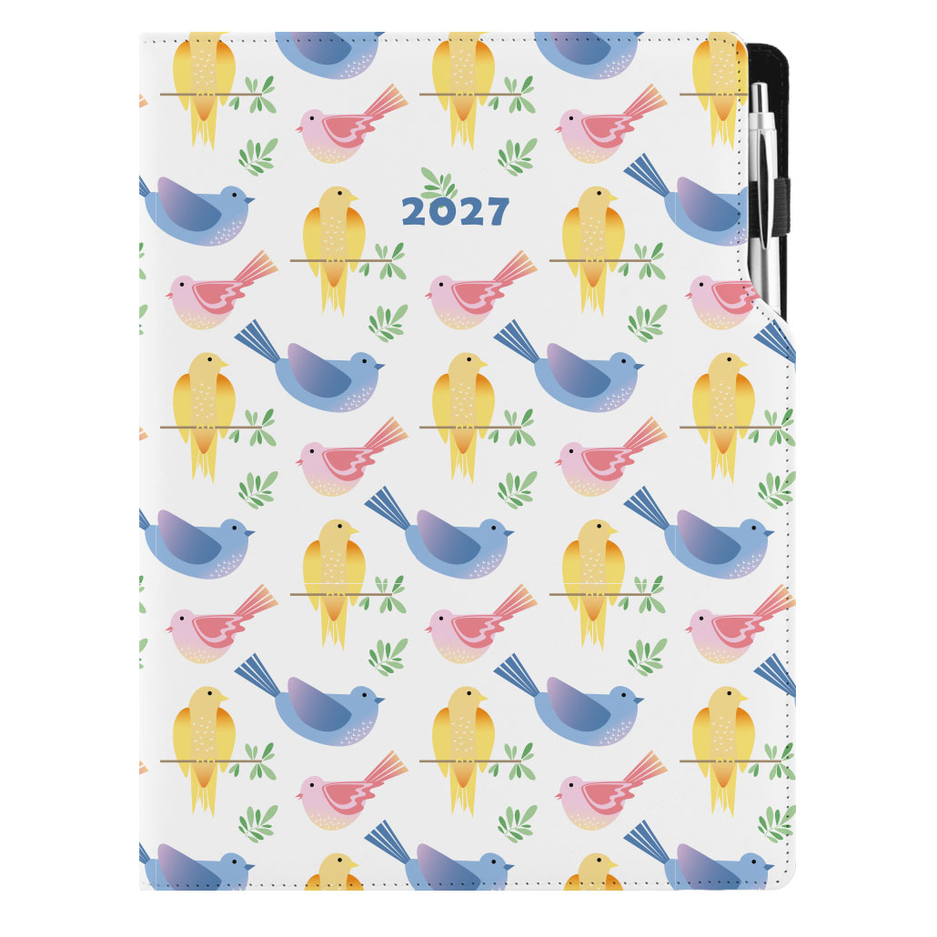 Diár obsahuje: okrúhle odtrhávcie rožky, bielu záložku a pero