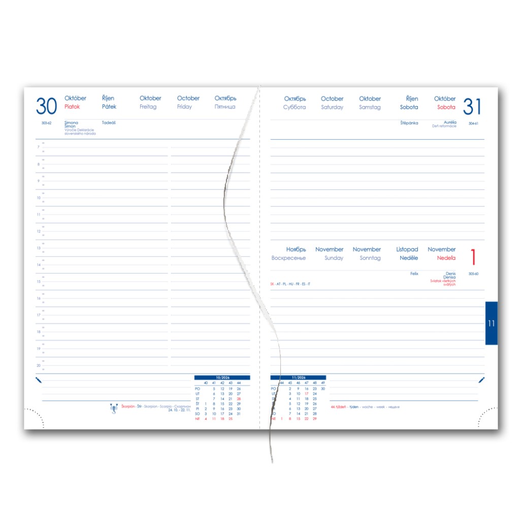 Diár obsahuje: okrúhle odtrhávacie rožky a bielou záložku