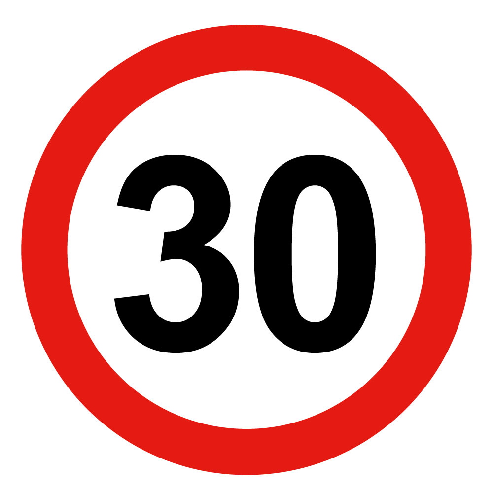 Najvyššia obmedzená/konštrukčná rýchlosť vozidla 30 km, bezpečnostná tabuľka, plast 0,5 mm - kruh 15 cm