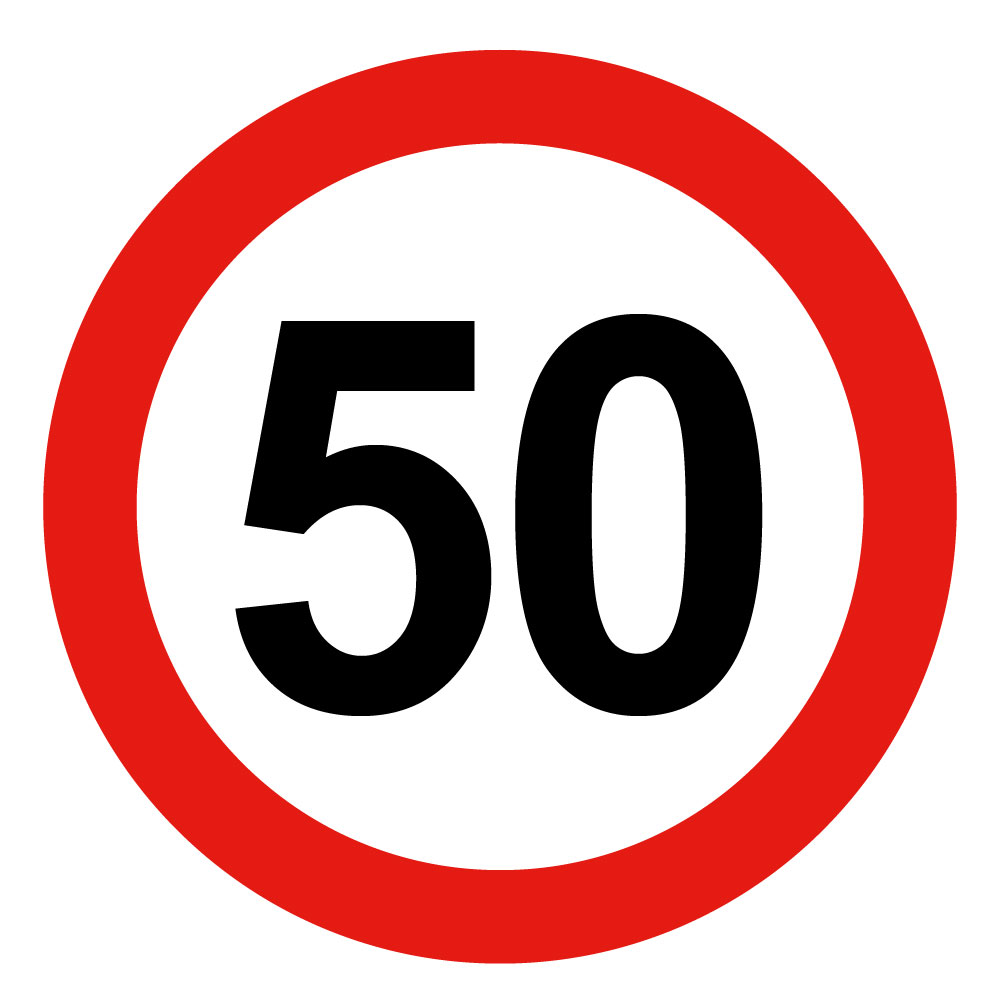Najvyššia obmedzená/konštrukčná rýchlosť vozidla 50 km, bezpečnostná tabuľka, samolepka - kruh 20 cm